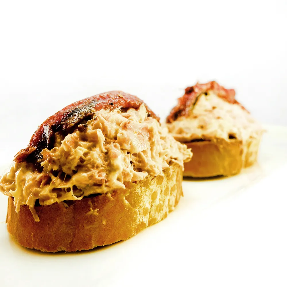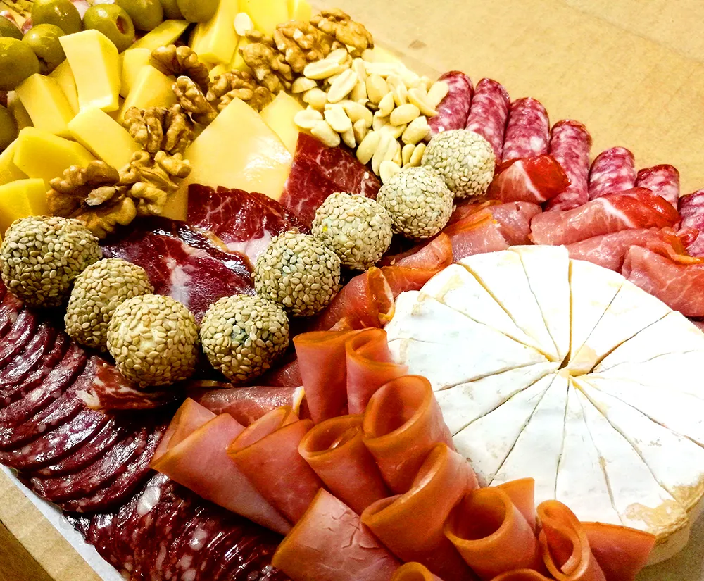 Jamón serrano, salamini, bondiola, queso gouda, fontina, pategras y bolitas de roquefort. Aceitunas y frutos secos.